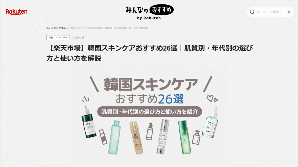 みんなのおすすめ by Rakuten 【楽天市場】『韓国スキンケアおすすめ26選|肌質別・年代別の選び方と使い方を解説』が更新されました。